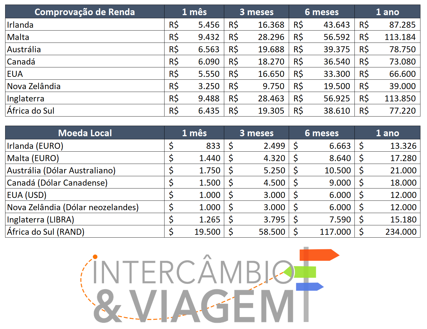 | Inglaterra | Curso de Inglês (Longa Duração) | R$ 47.000 – R$ 57.000 | £12.000 – £14.000 |
